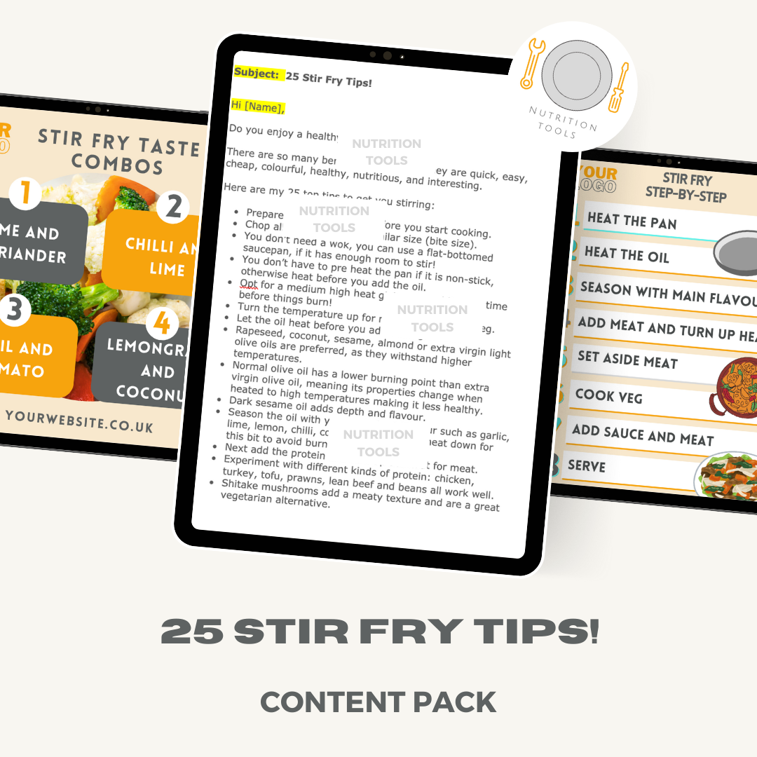 Email: This email provides 25 practical tips for creating a healthy, quick, and easy stir fry. It emphasises the benefits of stir-frying, such as its simplicity, affordability, and nutritional value. Key tips include preparing ingredients ahead of time, choosing the right oil, experimenting with different proteins, and adding colorful vegetables. It suggests using homemade sauces to avoid store-bought options high in salt and sugar and offers alternative bases like brown rice or vegetable noodles. The email encourages trying new flavours and garnishes to keep meals exciting and nutritious, perfect for a quick yet healthy meal.