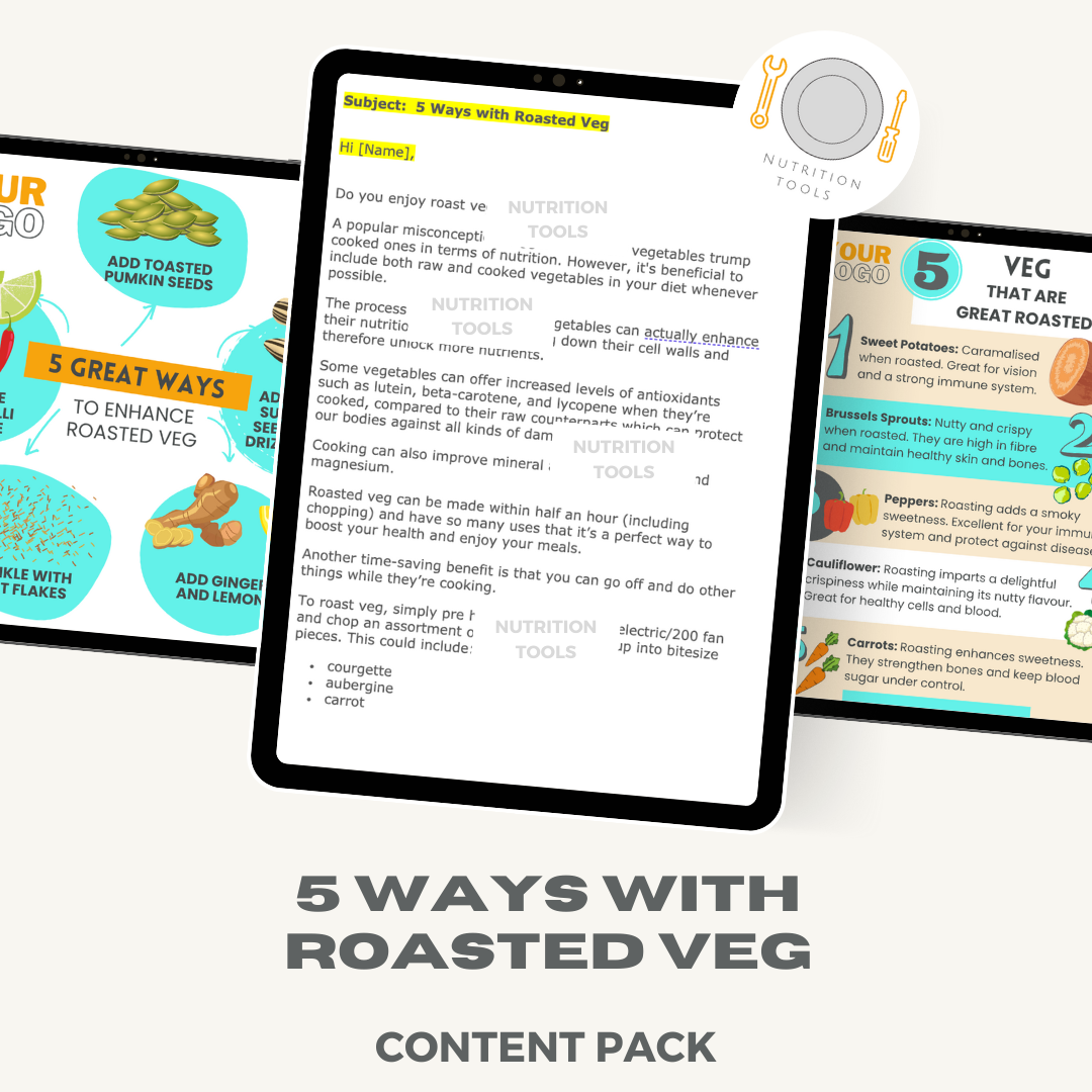 Email: This email highlights the benefits of incorporating both raw and cooked vegetables into your diet, with a special focus on roasting vegetables. It explains how cooking certain vegetables can enhance their nutritional value, increase antioxidant levels, and improve mineral absorption. The email offers a simple roasting method and suggests various ways to use roasted vegetables in different meals, including pasta, wraps, veg bakes, salads, and soups. The goal is to make healthy eating easy and convenient, while also showcasing the versatility of roasted vegetables in everyday meals.