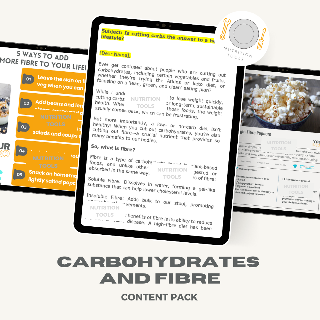 Email: This email discusses the common trend of cutting carbohydrates in diets like Atkins or keto and explains why it isn't a sustainable or healthy long-term solution. It highlights the importance of fibre, a type of carbohydrate essential for heart health, diabetes management, and digestive wellbeing. The email explains the difference between soluble and insoluble fibre and their benefits, while also emphasising that most UK adults don't consume enough fibre. It encourages readers to focus on whole, unprocessed carbs found in fruits, vegetables, whole grains, and legumes, rather than eliminating them entirely.