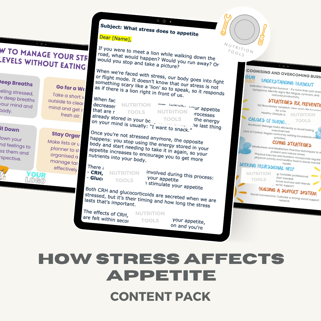 Email: This email explores how stress affects appetite, explaining the body's response to stress through fight-or-flight mechanisms. It introduces two key hormones, CRH and glucocorticoids, and their role in appetite suppression and stimulation. The email discusses how different types of stress can either decrease or increase appetite, especially when dealing with ongoing, low-level stress. It offers practical tips for managing stress and avoiding unhealthy eating habits, encouraging readers to make mindful food choices and reduce stress through relaxation and self-care strategies.