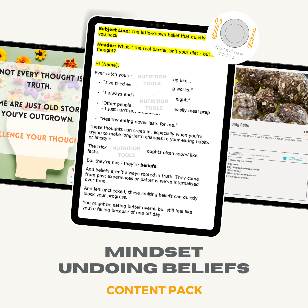 Email: This powerful mindset email helps clients uncover the hidden thoughts that sabotage progress with food and lifestyle changes. Using a simple “Thought Audit” exercise, readers learn how to identify and challenge limiting beliefs like “I always fail at healthy eating” or “I’m just not disciplined enough.” A great resource to shift the inner narrative and support long-term, sustainable change.
